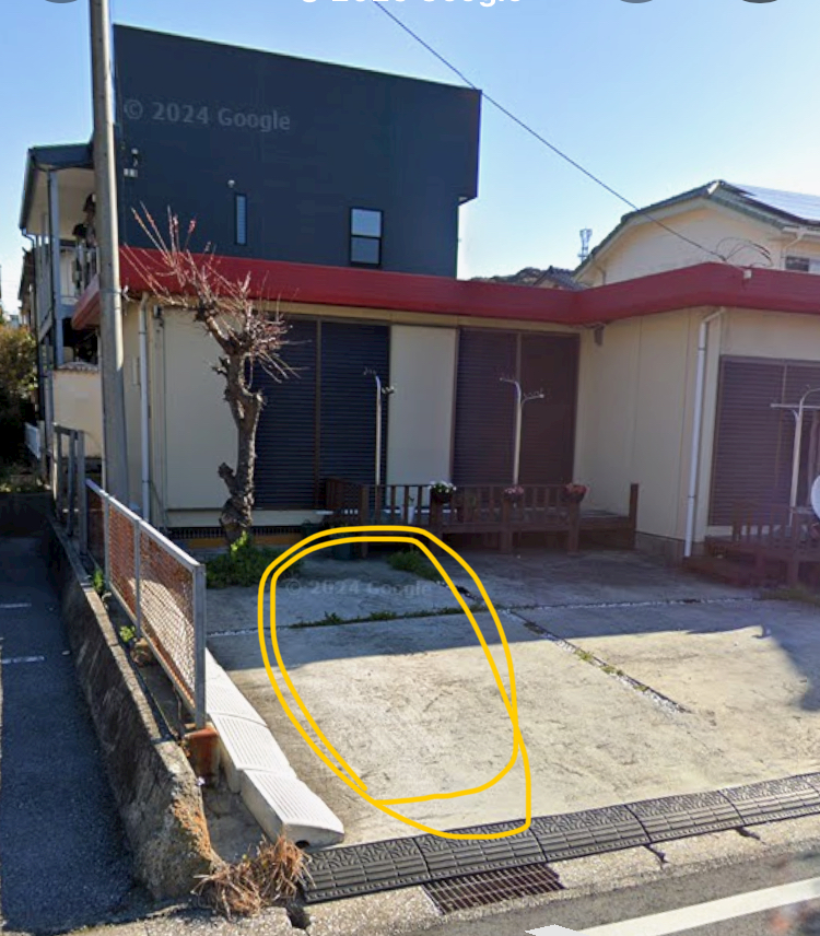 ※駐車場はお店の前にございます。下記の画像の黄色い枠の辺りに止めてください。